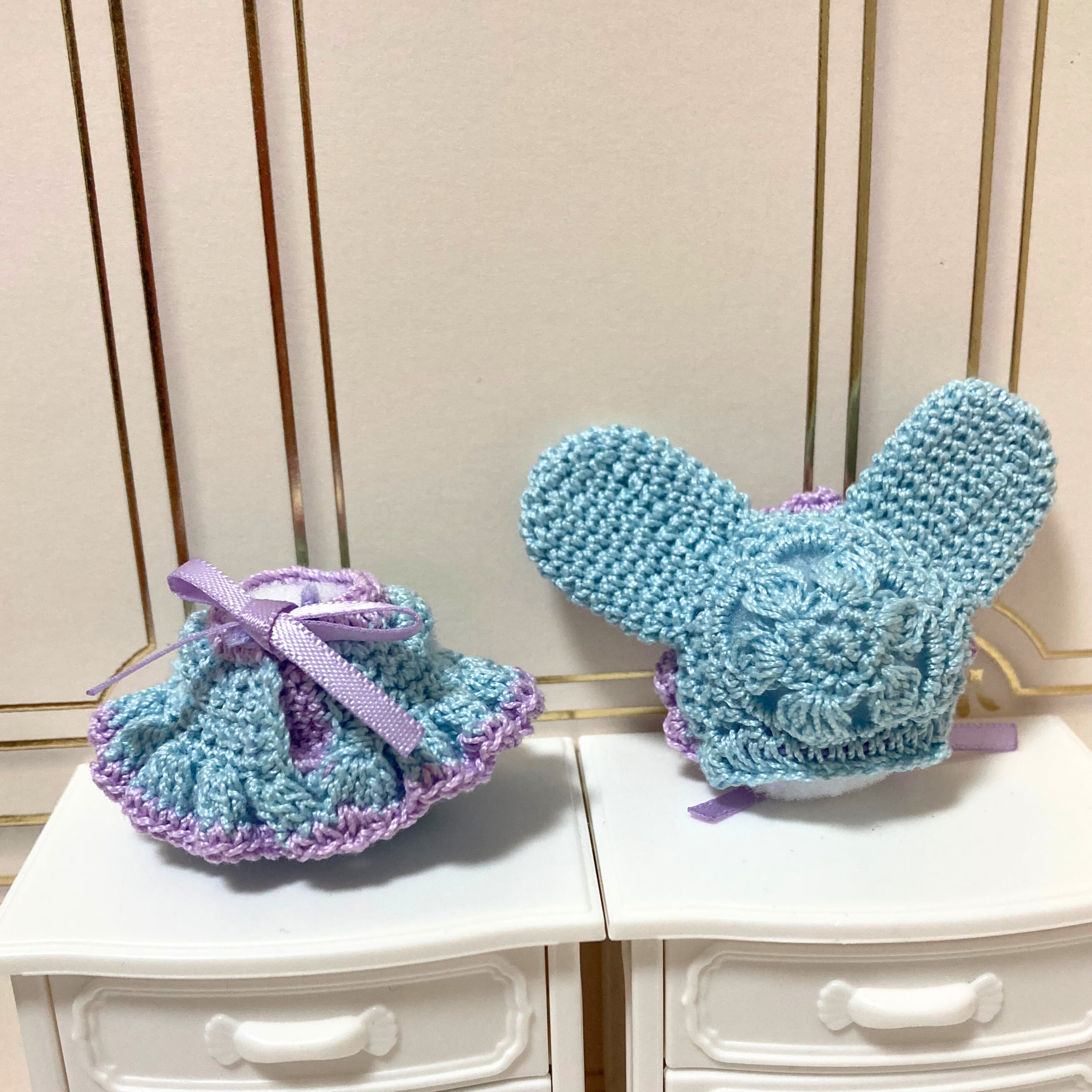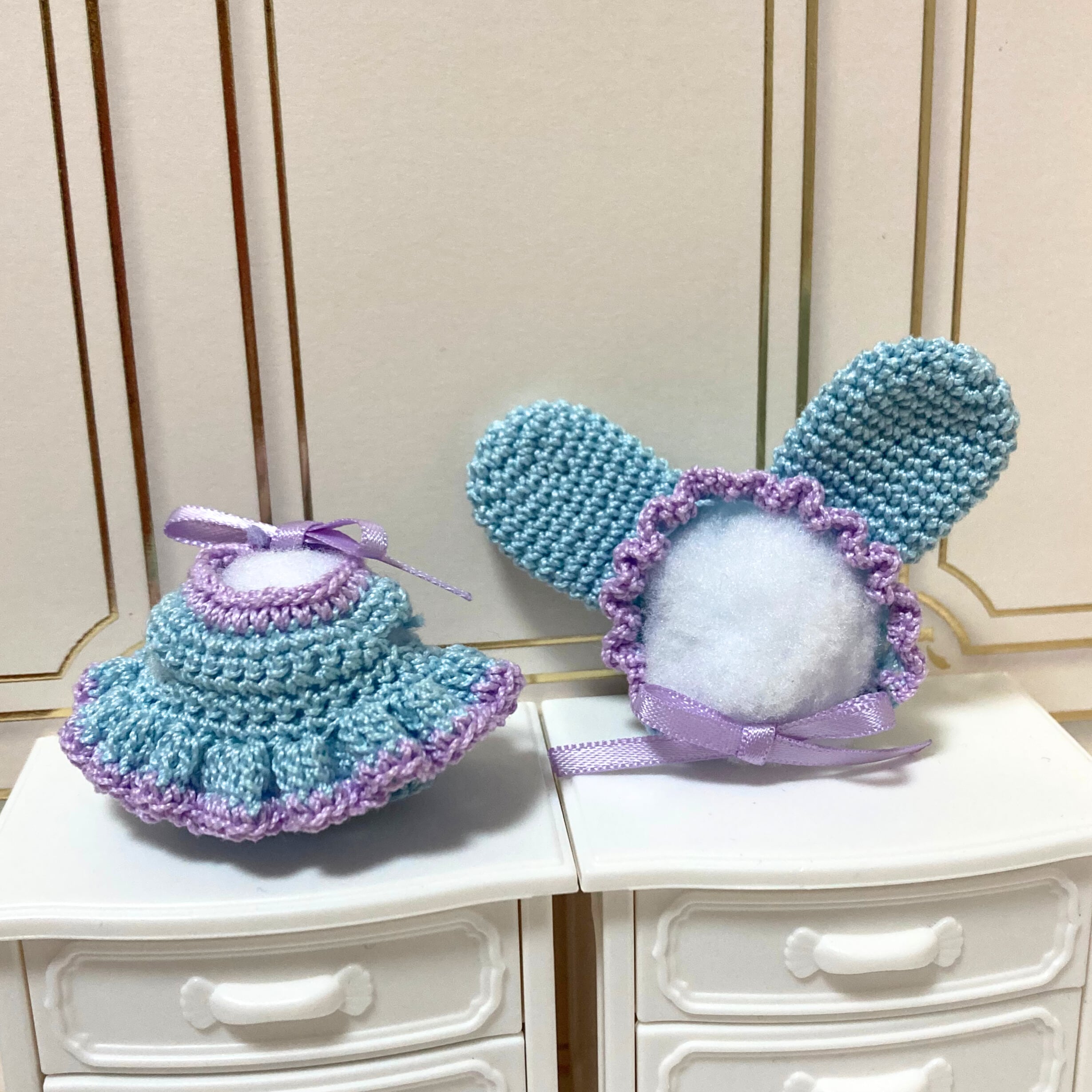 身長5cm程のお人形サイズで編んだうさ耳ボンネットとカバーオールのセットです。