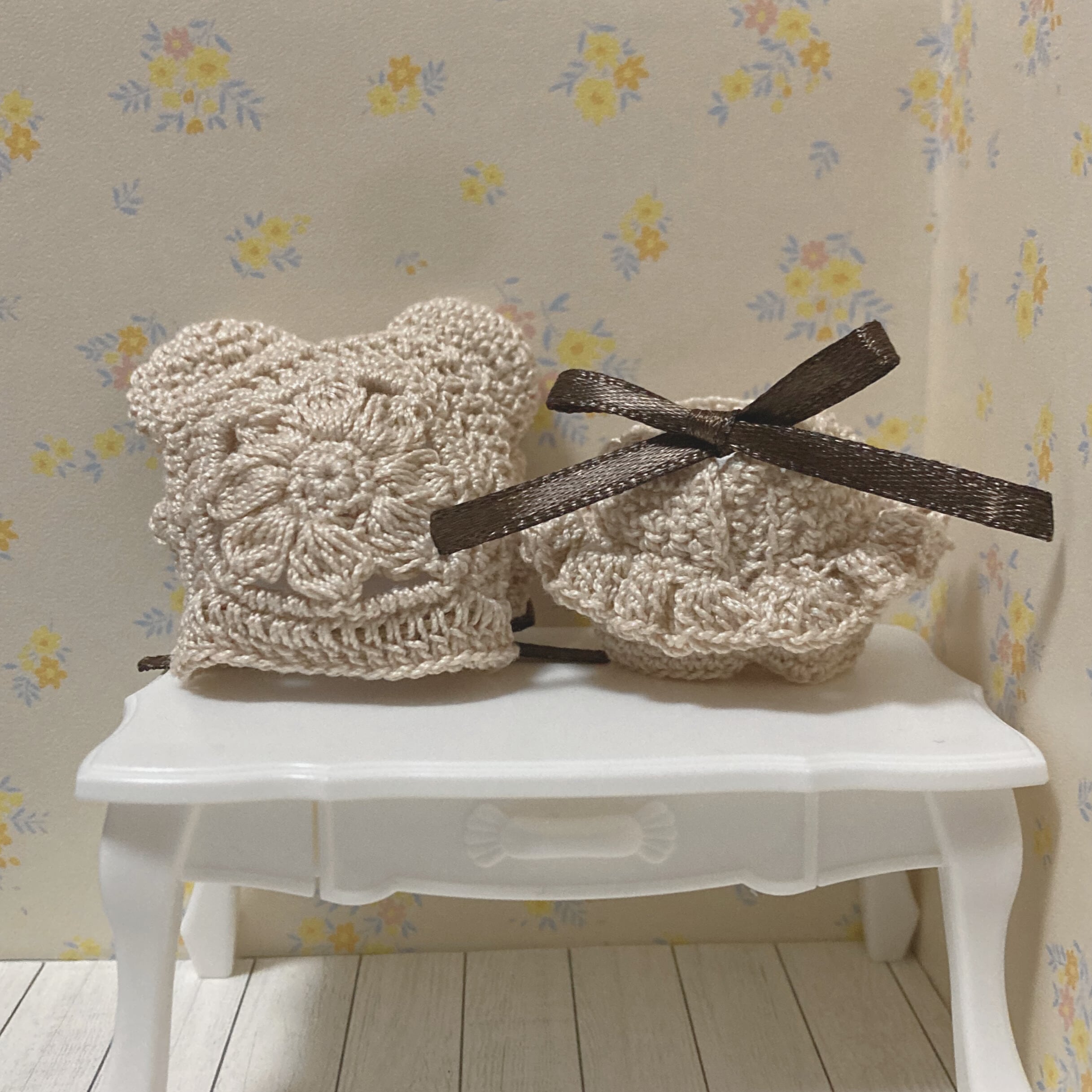 身長5cm程のお人形サイズで編んだくま耳ボンネットとカバーオールのセットです。
